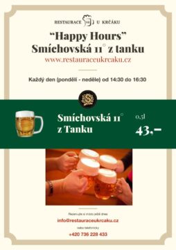 Happy Hours jsou u nás od pondělí do neděle mezi 14:30 a 16:30 a čepujeme v nich Smíchovskou JEDENÁCTKU Z TANKU za pouhých 43,- Kč (samozřejmě za půllitr), tak neváhejte a přijďte v tento čas.